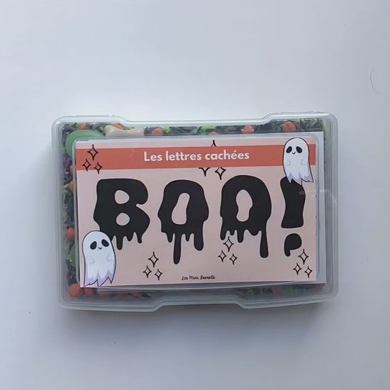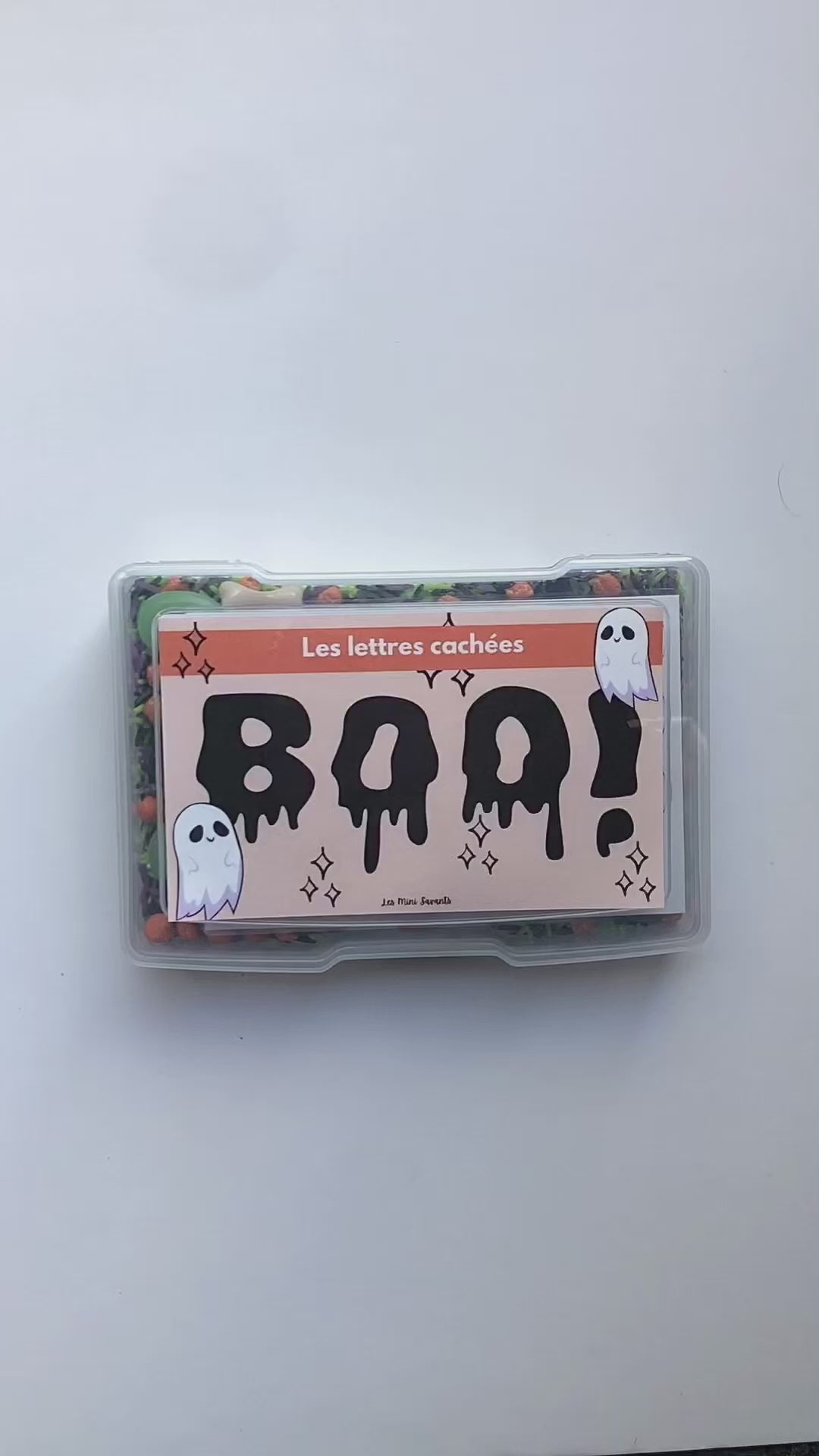 - Les lettres cachées: mélange sensoriel avec une fiche de lettres cachée dans le fond de la boite, déplace le mélange avec le balai et encercle la lettre trouvée sur l'autre fiche (attention, contient des petits objets).
